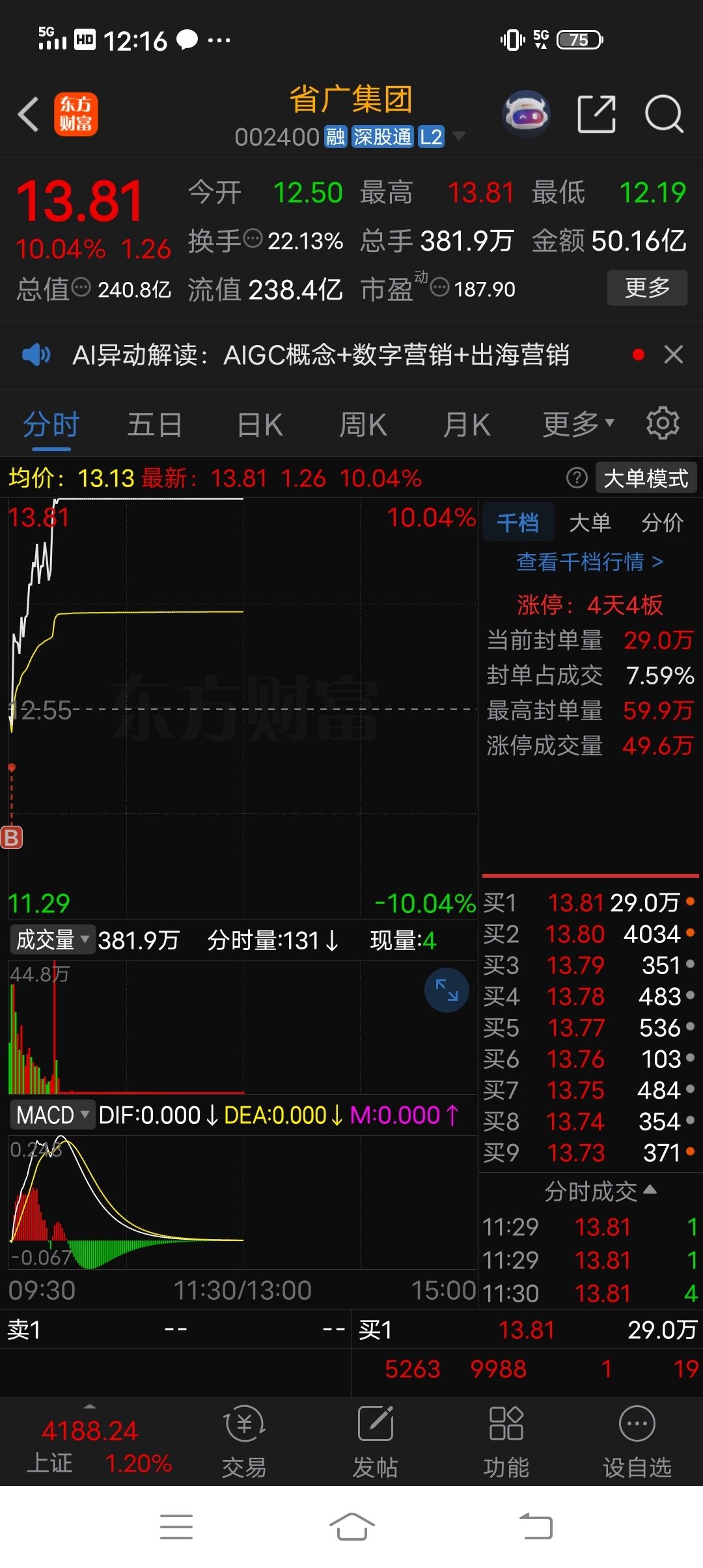 $省广集团(SZ002400)$ 买入拼手速,12.2的成本。完美