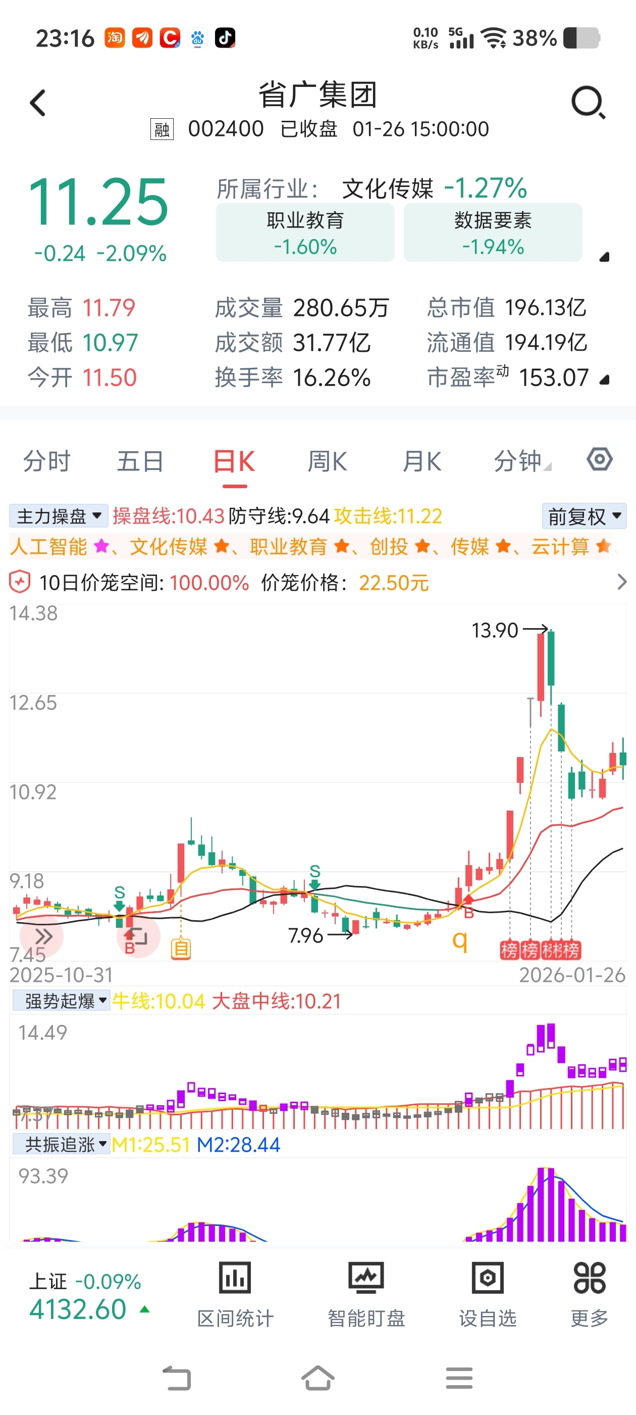 26/1/26省广集团00240011.25元目前没有跌破11.22元主力攻击线
