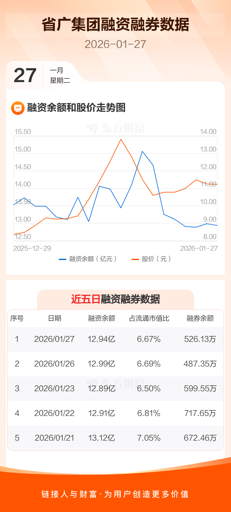 交易所最新数据显示,省广集团于2026年1月27日获融资买入2.93亿元,融资偿还2.99亿元,当日融资净偿还572.44万元。目前,该股融资余额12.94亿,占流通市值比例为6.67%。
