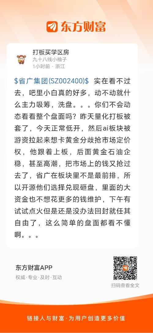 $省广集团(SZ002400)$ 实在看不过去,吧里小白真的好多,动不动就什么主力吸筹,洗盘。。。你们不会动态看看整个盘面吗?昨天量化打板被套了,今天正常低开,然后ai板块被游资拉起来想卡黄金分歧抢市场定价权,他跟着上板,后面黄金石油企稳,甚至高潮,把市场上的钱又抢过去了,省广在板块里不是最前排,所以开源他们选择兑现砸盘,里面的大资金也不想花更多的钱维护,下午有试试点火但是还是没办法回封就任其自由了,这么简单的盘面都看不懂啊。。。