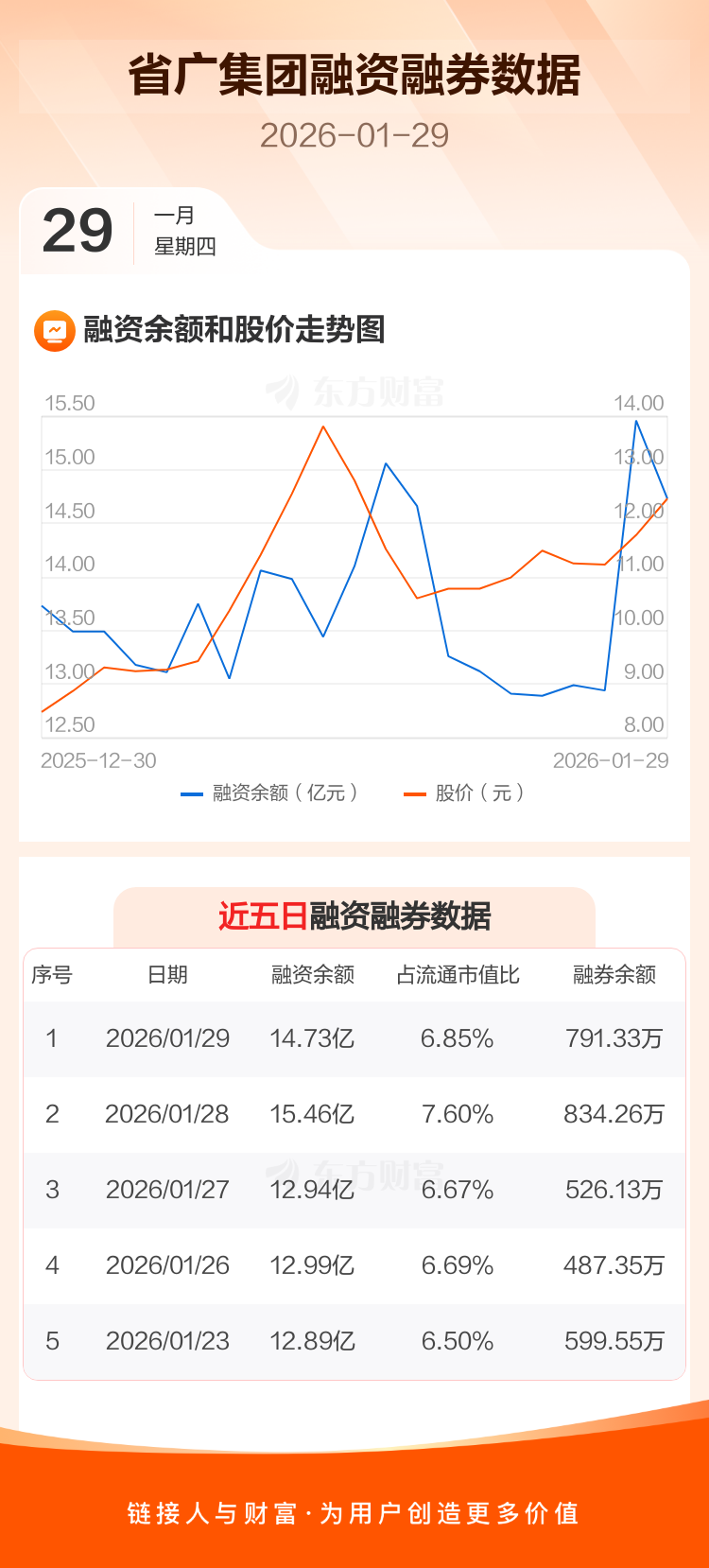 交易所最新数据显示,省广集团于2026年1月29日获融资买入8.35亿元,融资偿还9.08亿元,当日融资净偿还7334.93万元。目前,该股融资余额14.73亿,占流通市值比例为6.85%。