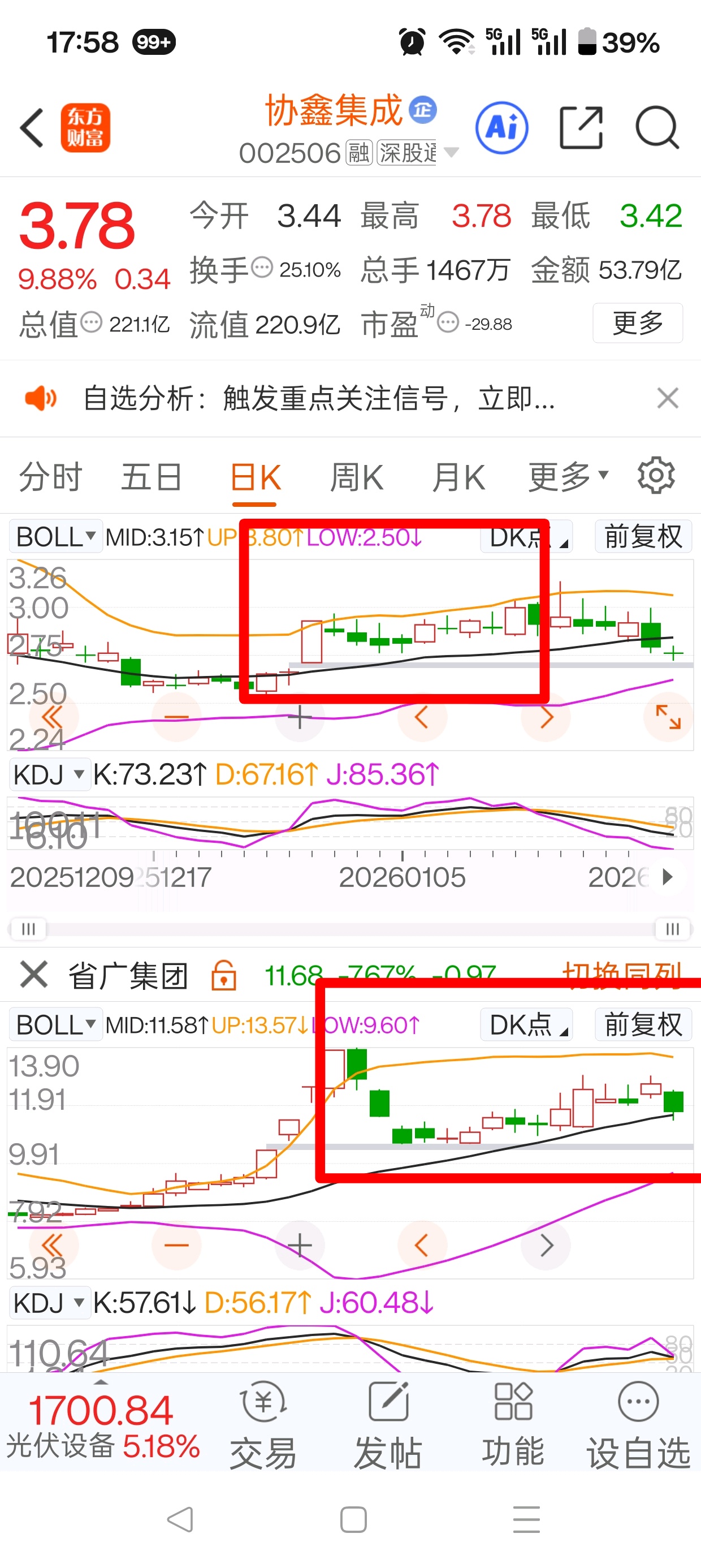$省广集团(SZ002400)$ 你们看,这两个股,走势像不像?股价不跌破中轨线,那才叫奇了怪了。都是高位出现三只乌鸦,都是一样的走势,方框图里。明天不卖出,还等什么?