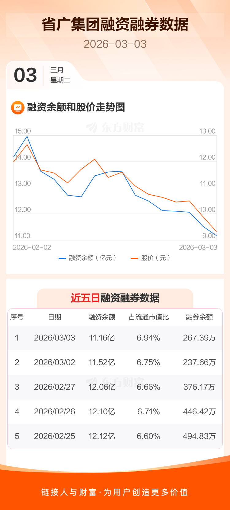 交易所最新数据显示,省广集团于2026年3月3日获融资买入1.08亿元,融资偿还1.44亿元,当日融资净偿还3595.27万元。目前,该股融资余额11.16亿,占流通市值比例为6.94%。