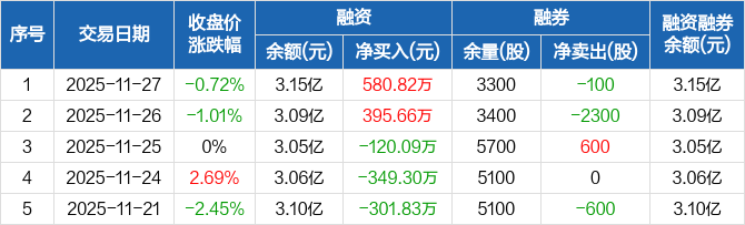 中远海科:融资净买入580.82万元,融资余额3.15亿元(11-27)