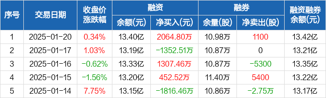 和而泰:融资净买入2064.8万元,融资余额13.4亿元(01-20)