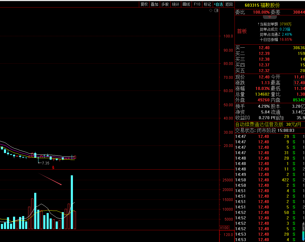 2. 福鞍股份。福鞍股份昨日出首板,月线部分上个月出历史新高量,大量资金抄底进场。符合我说的低位+天量形态,这种类型的股票标的,都是比较不错的投资对象。