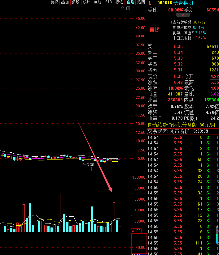 1. 长青集团。长青集团的走势跟先达股份十分类似。去年12.23起第一浪,随后调整一个月,昨天启动一板,该票股票也是处于低位水平。且前两个月有天量放出,符合低位+天量的形态。今日有高开可以直接考虑进场。