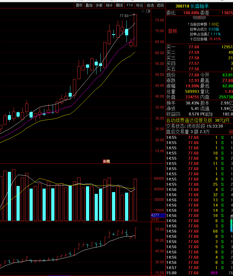 昨日长盛轴承出涨停,量能释放还行,不是太高,我们观察所有个股的历史走势,大家都会发现,最高价,往往对应的就是最高量,而目前我也是一直在摸索着长盛轴承的高在做打算。之前也提醒了,要等一个天量出来,才考虑出清。目前天量未出,咱们还可以继续等等。今日预计盘中还会有高开,但是是否还能继续涨停,有待观察。如十点前未能成功继续封板,则考虑减仓。昨日涨停,今日未涨停,代表减速,减速就会接回调。那么就要及时的获利套现,