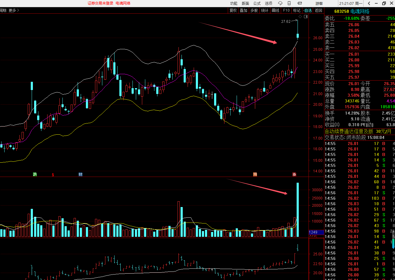 电魂网络是去年9.26走的第一浪,MCST大众平均成本线,开始出现上移。二浪调整至今年的一月六号。随后一路收小阳,我之所以选择涨停才进,也是图效率,涨停的利用率是最高的。昨天电魂网络没有收出连板,说明此刻主力发动的契机还没到时候,这个位置到底是想继续洗一下盘,还是再拉,基本上观察个三天就会出一个结果,所以该票我还是会选择继续等待。
