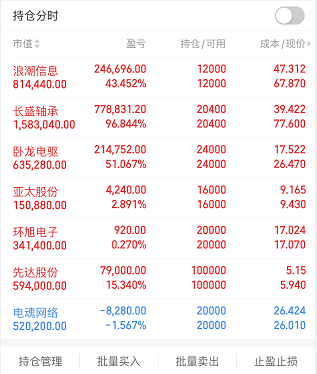 目前手上持仓的股票有浪潮信息、长盛轴承、卧龙电驱、日盈电子、亚太股份、环旭电子、先达股份以及昨日新进的电魂网络。