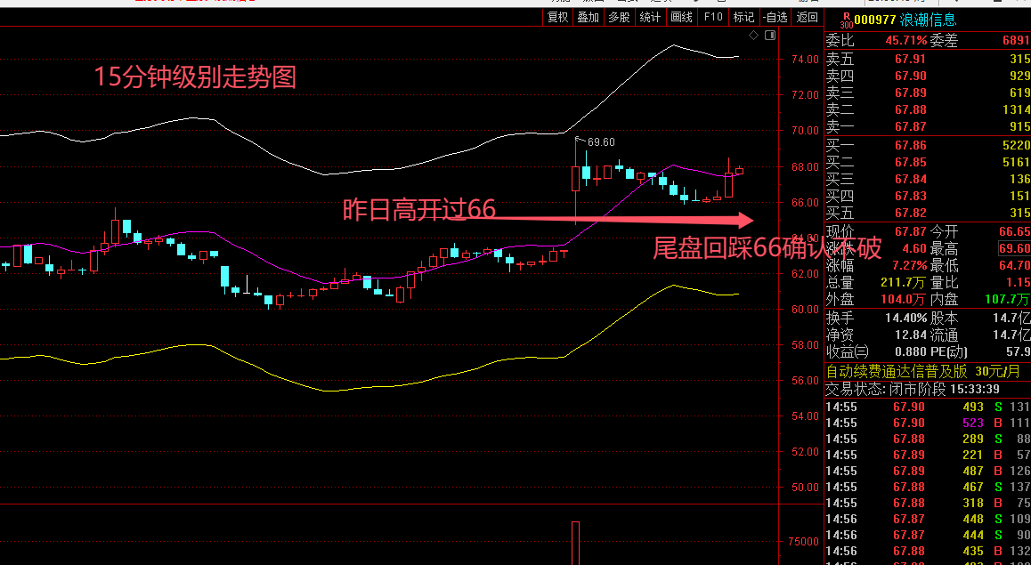 昨日突破66,并回踩66确认支撑,今日走势大概率会延续上涨趋势,但目前浪潮信息属于历史高位附近,参与的投资者都比较谨慎,做多意愿都不够强烈,每一只股票见顶最后一波行情都还会有一个诱多的结构。否则主力资金很难出货。因此在这个位置,除了前面跟一样底部建过仓的朋友可以继续持股外,不建议其他朋友在这个位置进场,现在博的也是他的最后一波诱多拉升行情,随时有可能会全部清仓止盈出局。不希望有人在这个位置来给我接盘。所以特别强调一下。今日走势的支撑位置仍旧在66块,能维持这个位置,可继续持股,一旦早盘低开,或者盘中跌破该位置,继续减仓。