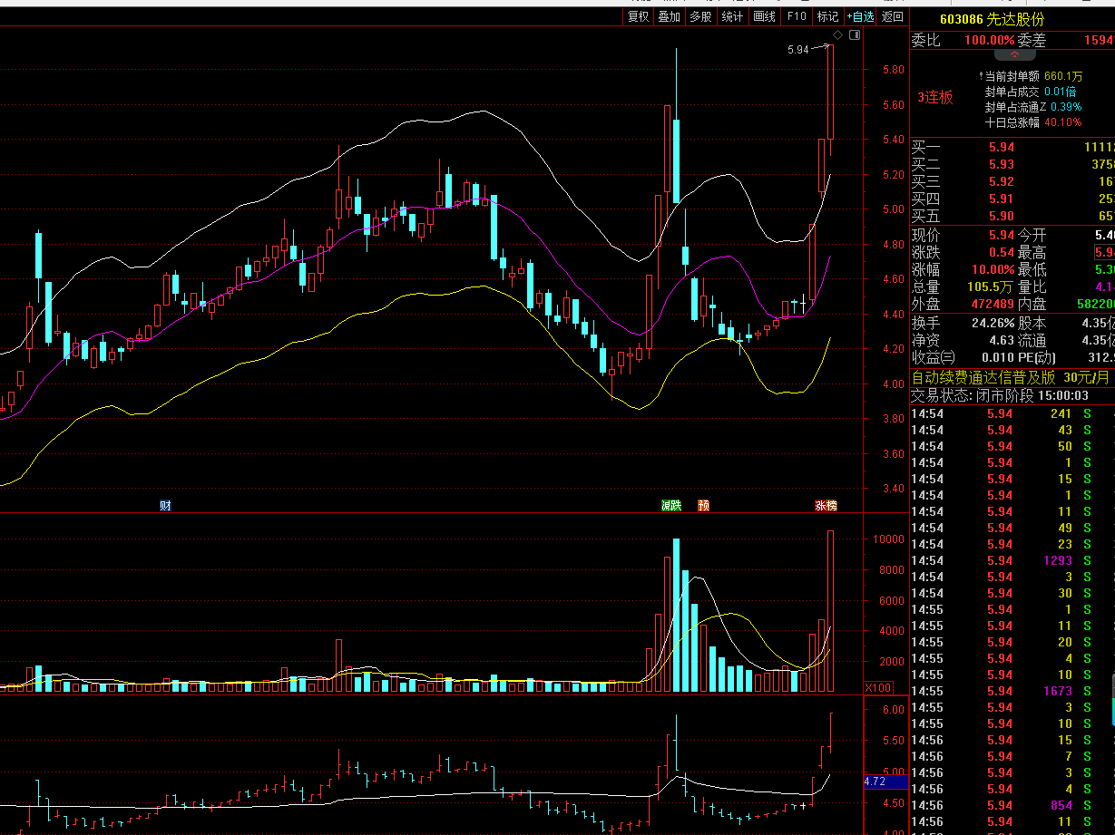 先达股份,就不多说了,目前已经进入的三连板走势,后面就看什么时候断板,什么时候获利了结了。每只涨停股票的进场,实际都是一次豪赌,有的中,有不一定会中,但是大家看我进场的这些票,就算是没中,也不会有太大的损失,及时调整仓位就行了。