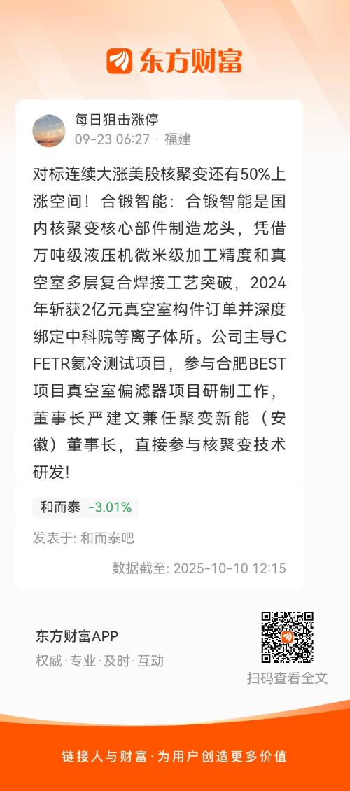 对标连续大涨美股核聚变还有50%上涨空间!合锻智能:合锻智能是国内核聚变核心部件制造龙头,凭借万吨级液压机微米级加工精度和真空室多层复合焊接工艺突破,2024年斩获2亿元真空室构件订单并深度绑定中科院等离子体所。公司主导CFETR氦冷测试项目,参与合肥BEST项目真空室偏滤器项目研制工作,董事长严建文兼任聚变新能(安徽)董事长,直接参与核聚变技术研发!