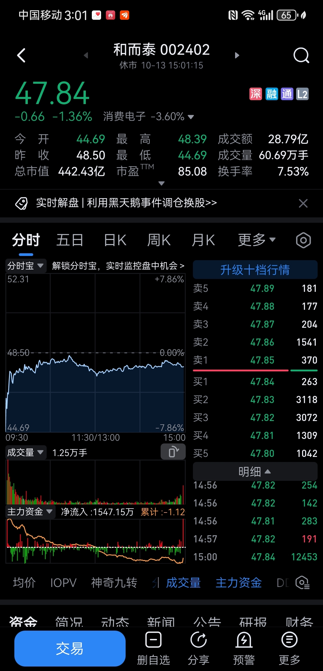 今天泰哥很不错了,消费电子板块大跌3.6%,泰哥低开高走,换手率仅7.53%,成交量创最近新低28.8亿,收盘仅跌1.36%,说好的跌停呢?开盘竞价随后直线拉升暴抢筹码,盘中一度拉至48.36,随后缩量震荡洗盘,收盘前5分钟主力打压竞价又抢筹!场内筹码均价50.48,还能跌多少?扛住了上周五的“黑天鹅”,必将骑上即将到来的大白马,一路高歌向北,一马平川!