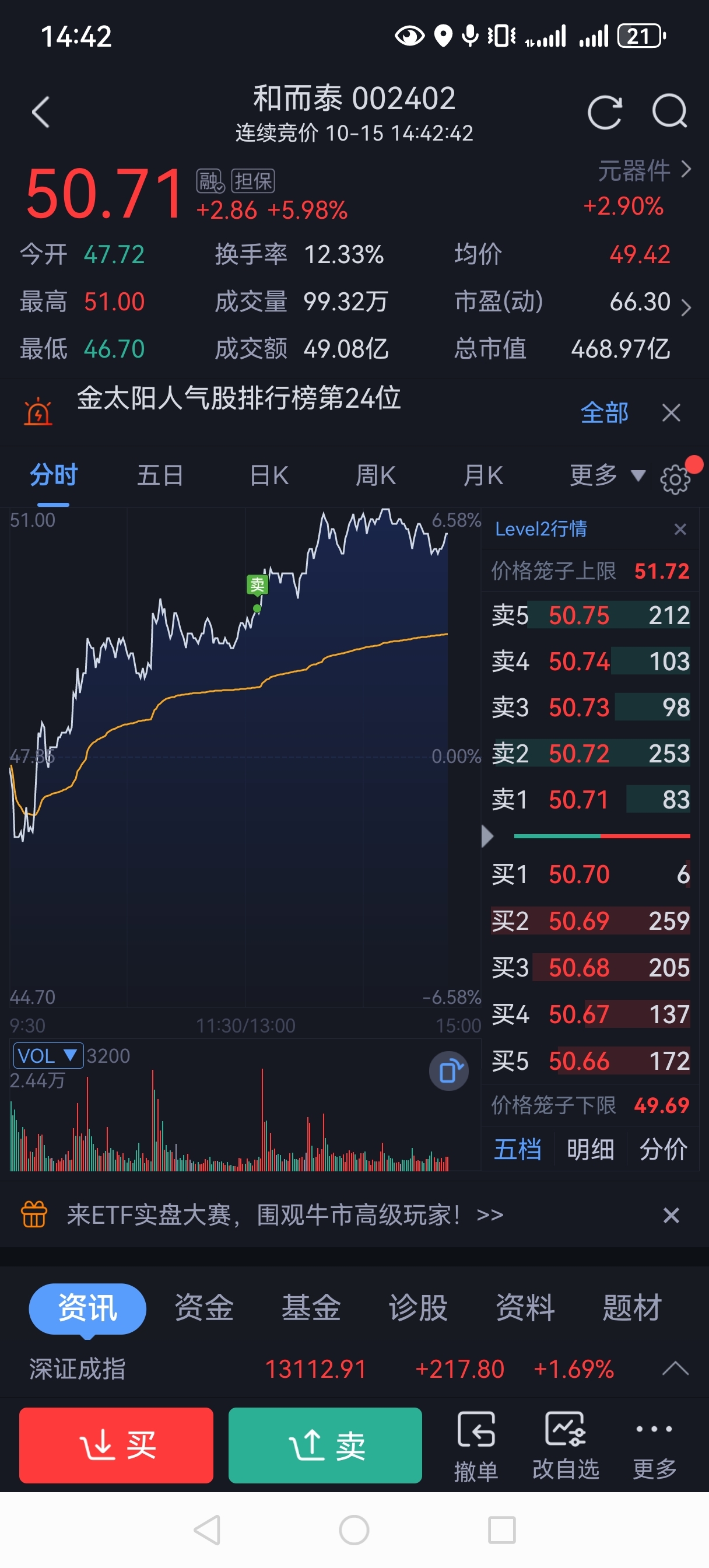 $和而泰(SZ002402)$ 49.70又一次卖错了,活跃好股。等下来吧。