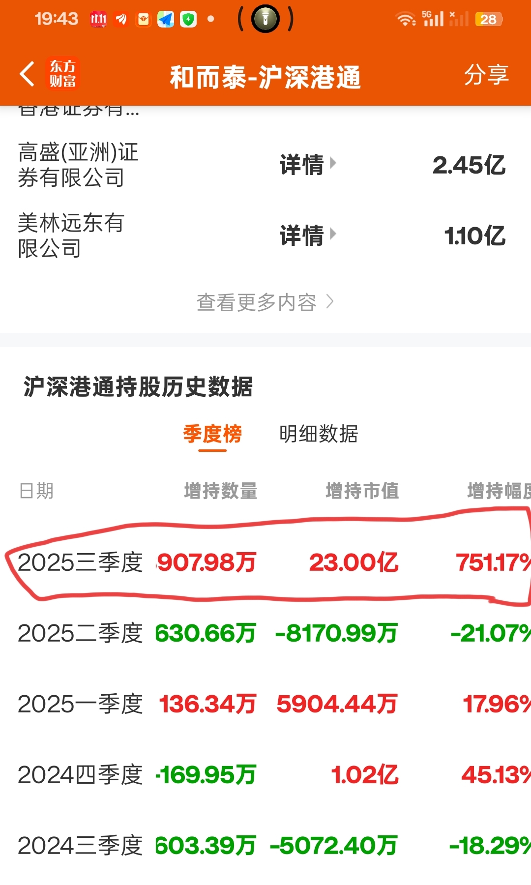 北向资金三季度增持幅度751%,增持23亿,三季度持有市值26亿,磨走追涨杀跌的超短线,下一步只等风浪稍息加油干,什么概念都不如抱紧资本的大腿,尽管它腿毛上沾满带血的筹码……