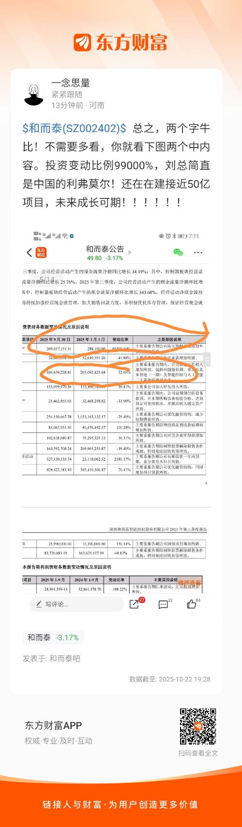 $和而泰(SZ002402)$ 总之,两个字牛比!不需要多看,你就看下图两个中内容。投资变动比例99000%,刘总简直是中国的利弗莫尔!还在在建接近50亿项目,未来成长可期!!!!!!