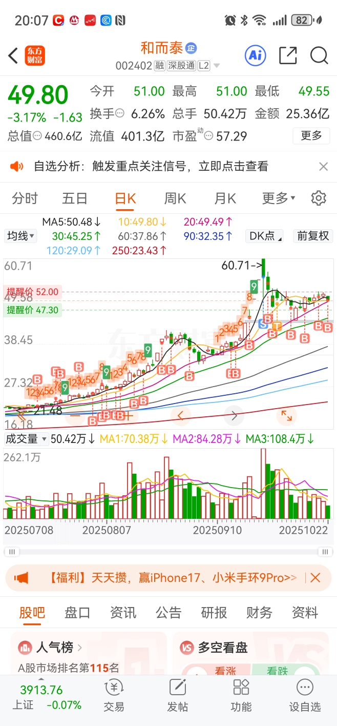 $和而泰(SZ002402)$ 明天51~52开盘?别告诉我涨停一字板开,这一路我怕了!