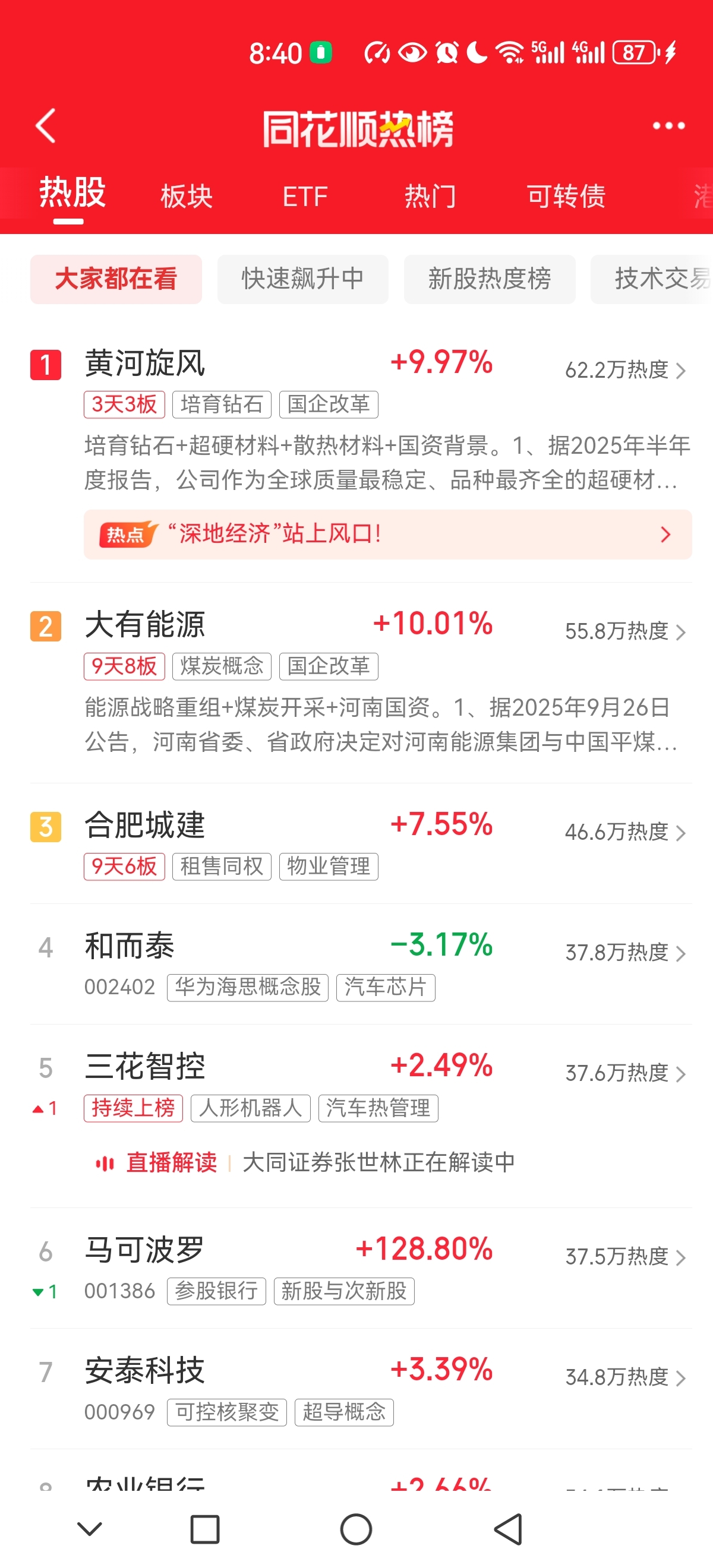 $和而泰(SZ002402)$ 同花顺热度排名第四了