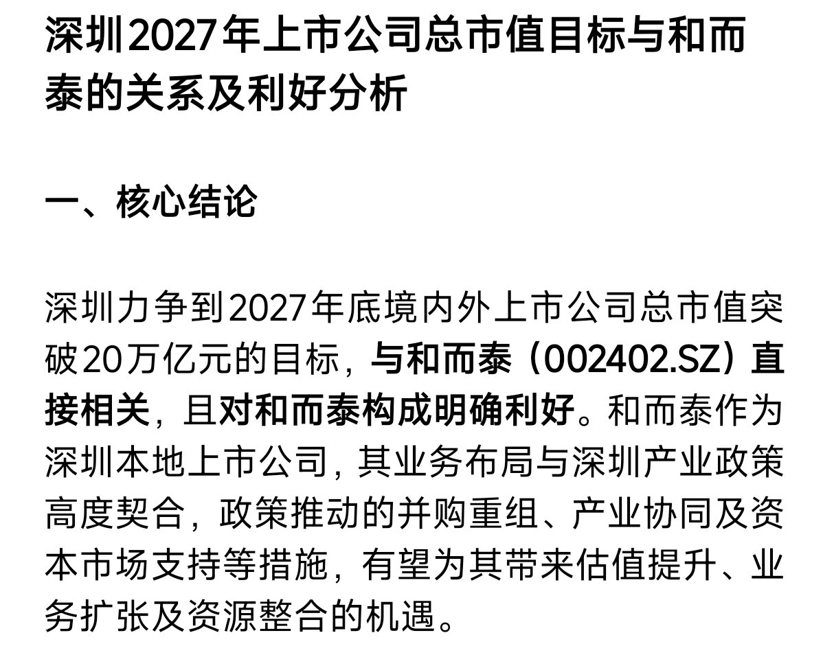 深圳2027年上市公司总市值目标与和而泰直接相关,且构成明确利好。和而泰作为深圳
