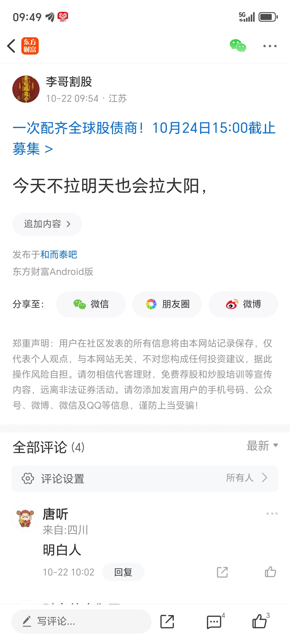 温馨提示: 1.根据《证券法》规定,禁止编造、传播虚假信息或者误导性信息,扰乱证券市场;2.用户在本社区发表的所有资料、言论等仅代表个人观点,与本网站立场无关,不对您构成任何投资建议。用户应基于自己的独立判断,自行决定证券投资并承担相应风险。《东方财富社区管理规定》