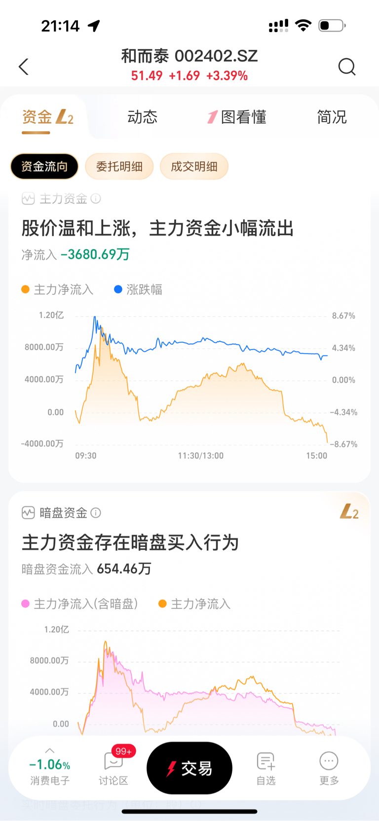 $和而泰(SZ002402)$ 主力暗盘谁说的进了2个亿?