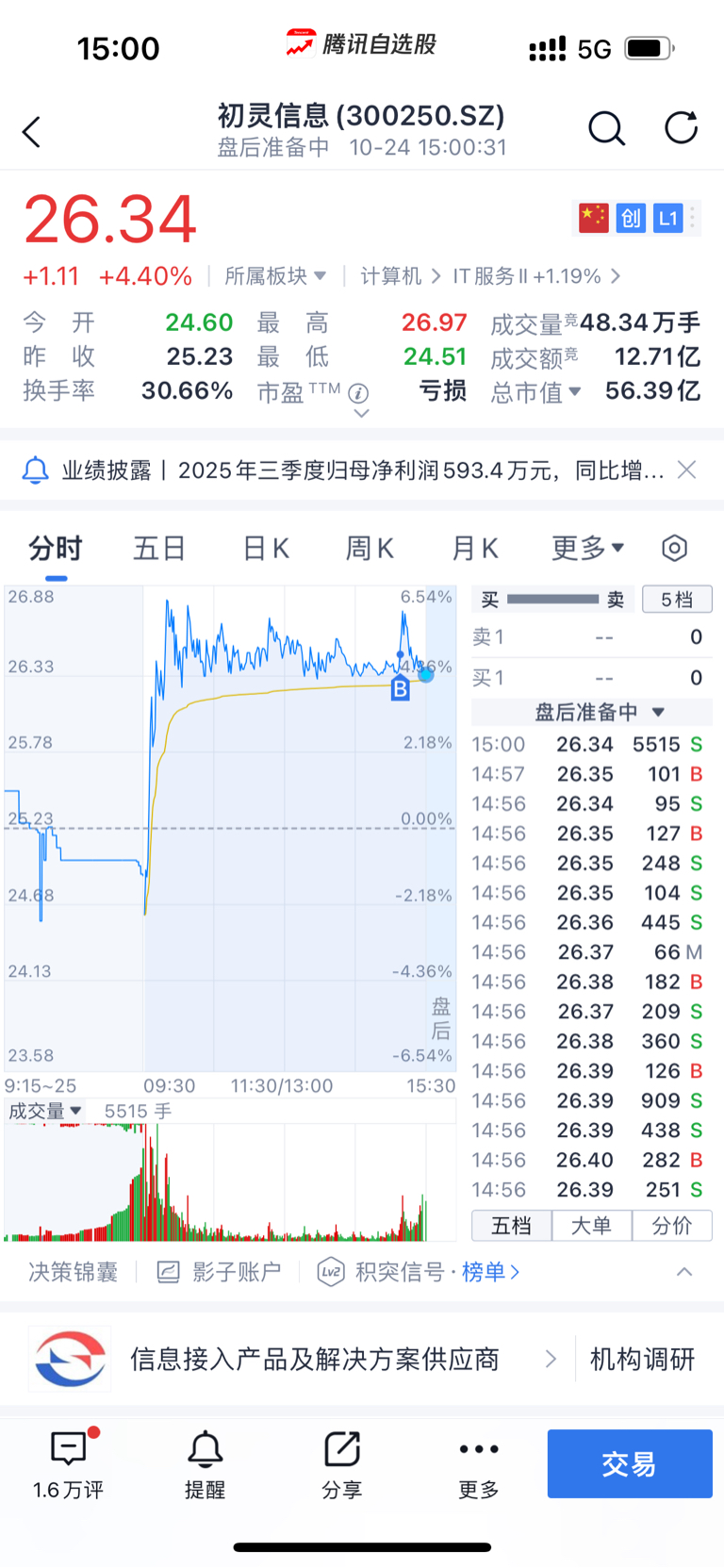和而泰前几天底部埋伏,今天顺势出点一层仓,后面每次新高将会陆续减仓,今天摩尔板块异动顺势买了一点初灵,这个是20厘米的龙头,初灵是摩尔线程板块里打高度的先锋,和而泰是容量核心龙头,左手和而泰,右手初灵信息,