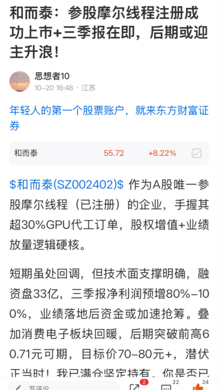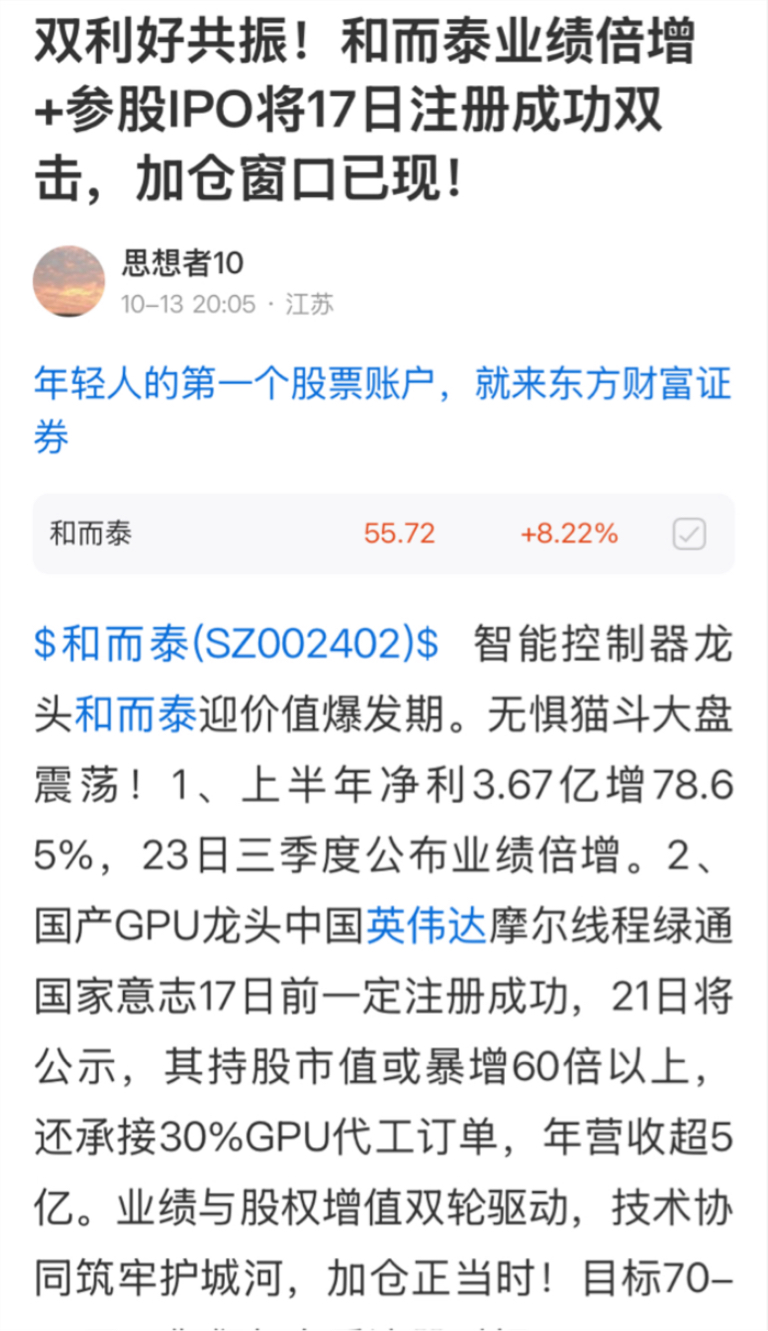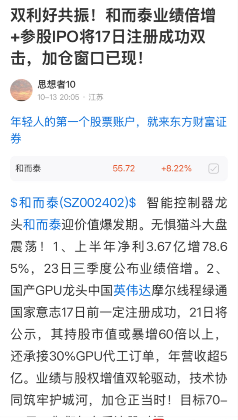 $和而泰(SZ002402)$ 本周大涨是技术面与消息面共振的必然结果。消息面上,公司上半年净利润预增65%-85%,规模效应与降本增效驱动盈利飙升;更携运动控制芯片等产品拿下头部车企1.2亿订单,并参股的摩尔线程过会引估值重估。技术面看,近期放量突破关键价位,周涨幅超10%,资金进场信号明确。