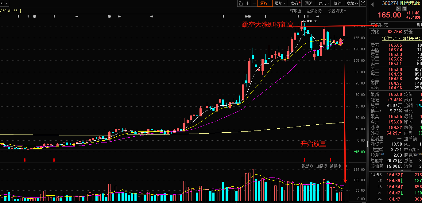 阳光电源300274:从昨天到今天连续大阳,说起来今天算是几个里面最强的,直接跳空高开就往上整了。后面除非大盘调整,不然还会继续主升的,这个标的踩点还没有差过。又是不错的空间带走。公司基于光伏逆变器应用开发了全球首台35KV直挂的光伏逆变器,基于光储充应用的多端口SST能量路由器,后期会持续研究和开发该技术的相关应用。