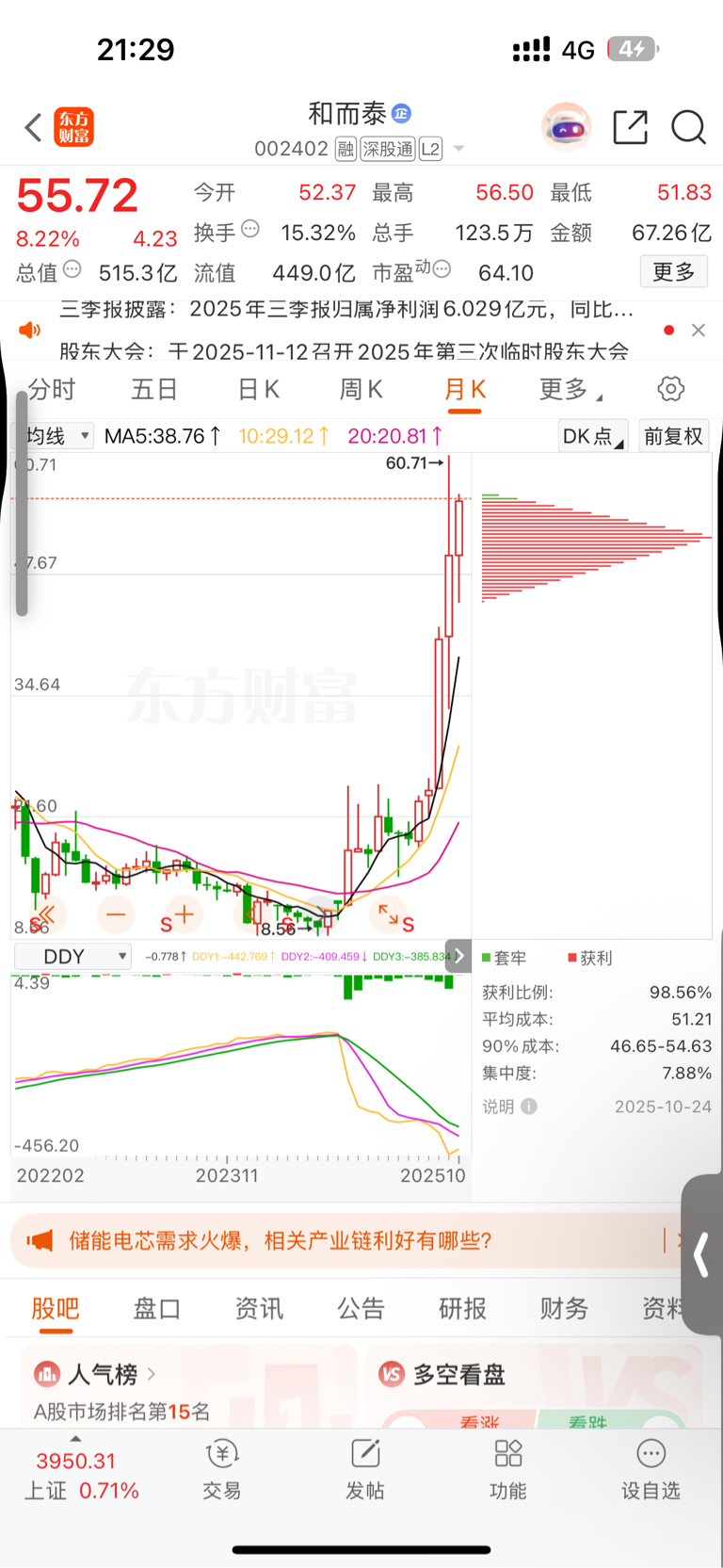 $和而泰(SZ002402)$ 月线有这么单一筹码峰的只此一家,一旦起爆就是火箭发射