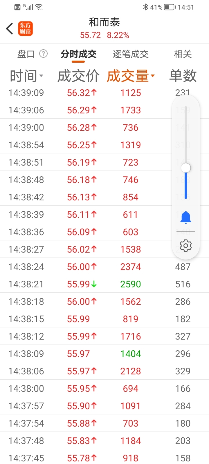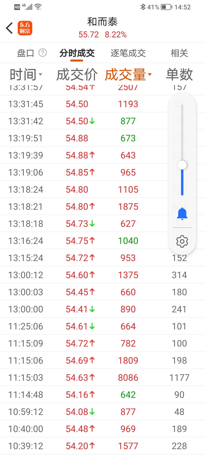 $和而泰(SZ002402)$ 正所谓兵马未动,粮草先行,星期五大量买盘买进,其中3笔1.3万手折合人民币2亿附近,一笔8000手折合人民币4500万附近。其它几千手单买进无数。未来几天突破上次60.71元是大概率的事。
