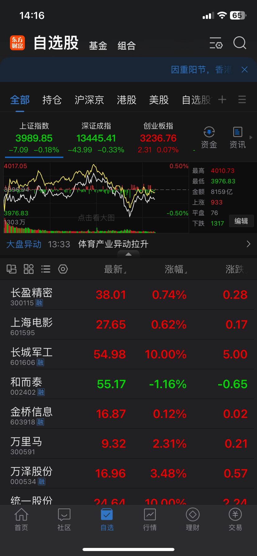 自选位置一个绿色,可以去买彩票了,看看能不能中一百万,