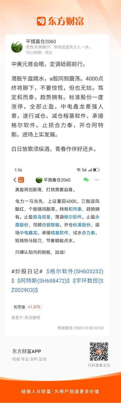 港股午盘跳水,a股同频震荡。4000点终将脚下,不要惊慌,但也无妨。笃定和而泰,趋势拥有。标准股份一度涨停,全部止盈。中电鑫龙差强人意,遂行减仓。减仓榕基软件,承接格尔软件。止损合力泰,开仓阿特斯。进场上实发展。