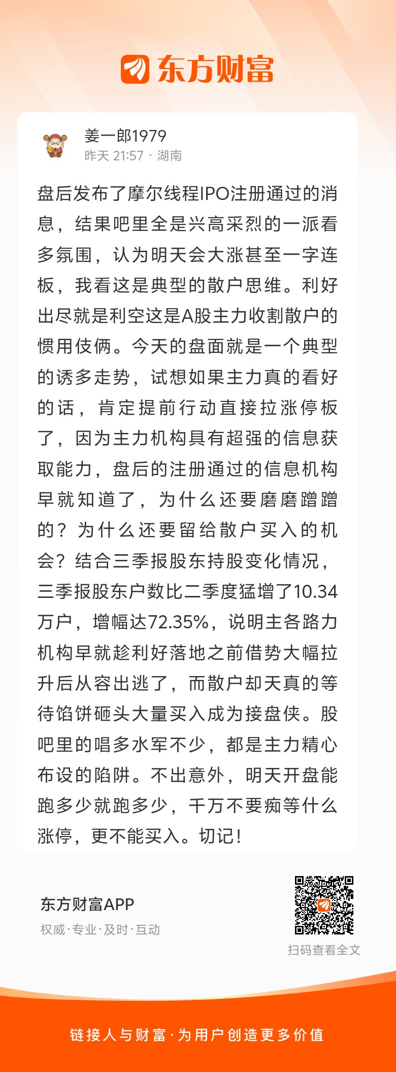 哥,讲得全对,可惜看到就已经来不及了。悲催啊,只能被割韭菜了。盘后发布了摩尔线程IPO注册通过的消息,结果吧里全是兴高采烈的一派看多氛围,认为明天会大涨甚至一字连板,我看这是典型的散户思维。利好出尽就是利空这是A股主力收割散户的惯用伎俩。今天的盘面就是一个典型的诱多走势,试想如果主力真的看好的话,肯定提前行动直接拉涨停板了,因为主力机构具有超强的信息获取能力,盘后的注册通过的信息机构早就知道了,为什么还要磨磨蹭蹭的?为什么还要留给散户买入的机会?结合三季报股东持股变化情况,三季报股东户数比二季度猛增了10.34万户,增幅达72.35%,说明主各路力机构早就趁利好落地之前借势大幅拉升后从容出逃了,而散户却天真的等待馅饼砸头大量买入成为接盘侠。股吧里的唱多水军不少,都是主力精心布设的陷阱。不出意外,明天开盘能跑多少就跑多少,千万不要痴等什么涨停,更不能买入。切记!