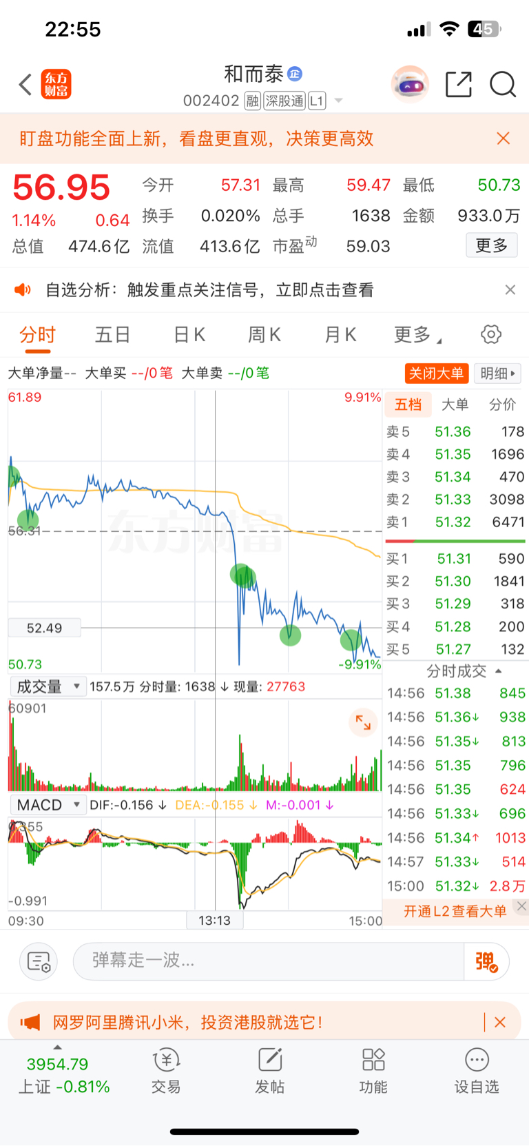$和而泰(SZ002402)$  新手炒股三个月了有始以来卖出最明智的一笔,该强不强就是弱,一浪比一浪底,卖出5分钟直线暴跌,记录一下自己的成长吧