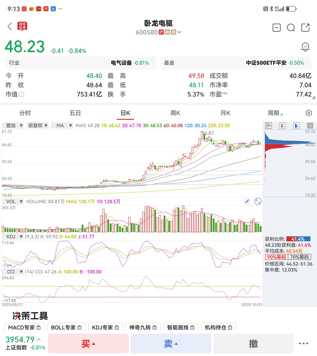 $和而泰(SZ002402)$ 跌不到哪去了!所有人成本都在50以上!老太所有赛道都是热门,业绩也够好!非经常性利润以后每年增50-60亿!投资的机器人也投产了!看卧龙电驱!最高点一个跌停板后,一个多月大盘和科技股两次大跌,肢价稳稳地固定在48元,即跌停板当天的最低价!老太基本面不比它差!人气也不比它差!