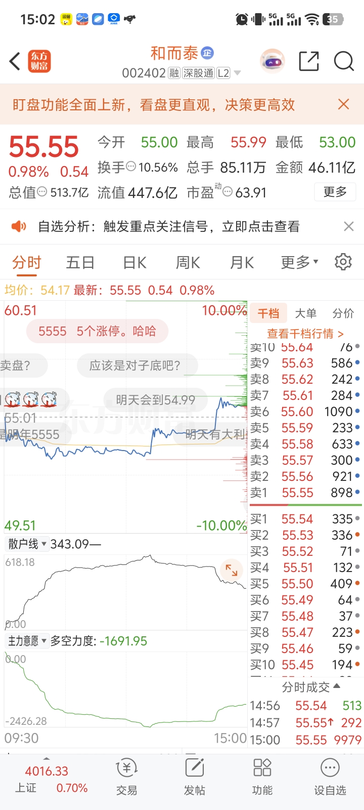 $和而泰(SZ002402)$ 收盘55.55那天股价各阶段比较魔幻,最终是涨的,个个喜气洋洋夸老庄厉害;周四水下到尾盘是涨的叠加摩尔注册通过,狗托能把股价吹上天;周五上午是涨的还在吹涨停、下午下杀虽反弹最终收在低点就说恶意操纵股价。