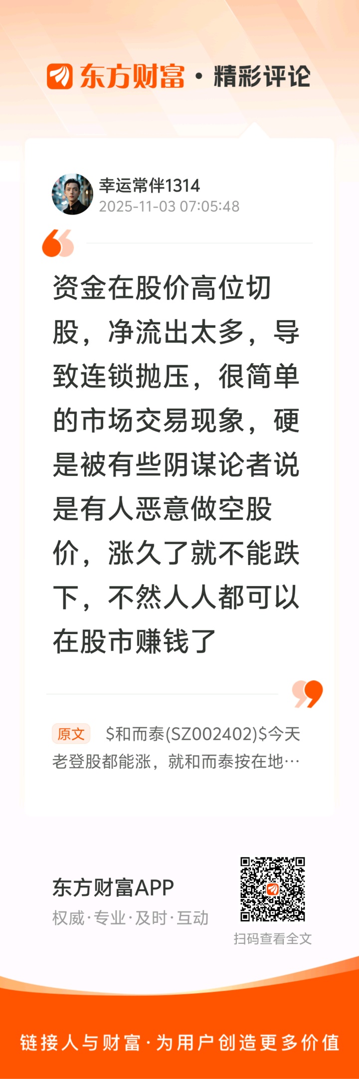 $和而泰(SZ002402)$ //@幸运常伴1314 :资金在股价高位切股,净流出太多,导致连锁抛压,很简单的市场交易现象,硬是被有些阴谋论者说是有人恶意做空股价,涨久了就不能跌下,不然人人都可以在股市赚钱了