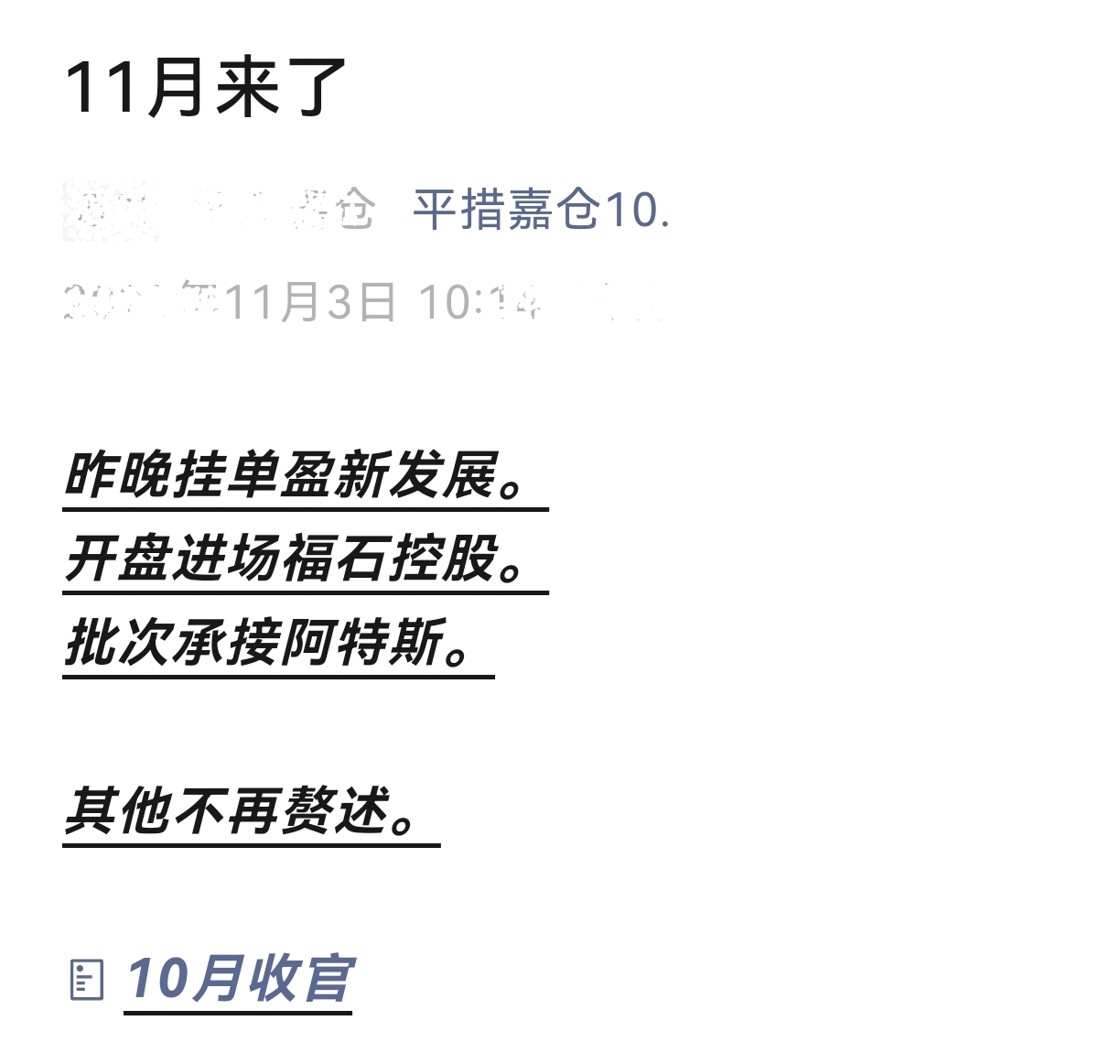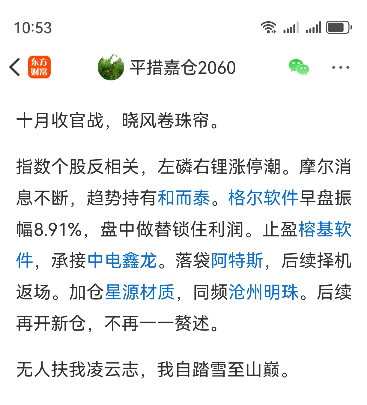 接下来俩月业绩空窗,化工原料传媒喘息之机。和而泰周五破掉趋势顺势减仓,从今日始批次承接。格尔软件冲高止盈,阿特斯二次返场。昨晚挂单盈新发展,格局持有中电鑫龙。开仓福石控股,其它帖文中未提及的标的一律按兵不动。