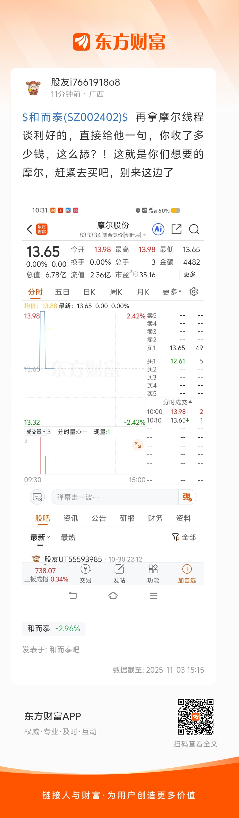 $和而泰(SZ002402)$ 再拿摩尔线程谈利好的,直接给他一句,你收了多少钱,这么舔?!这就是你们想要的摩尔,赶紧去买吧,别来这边了