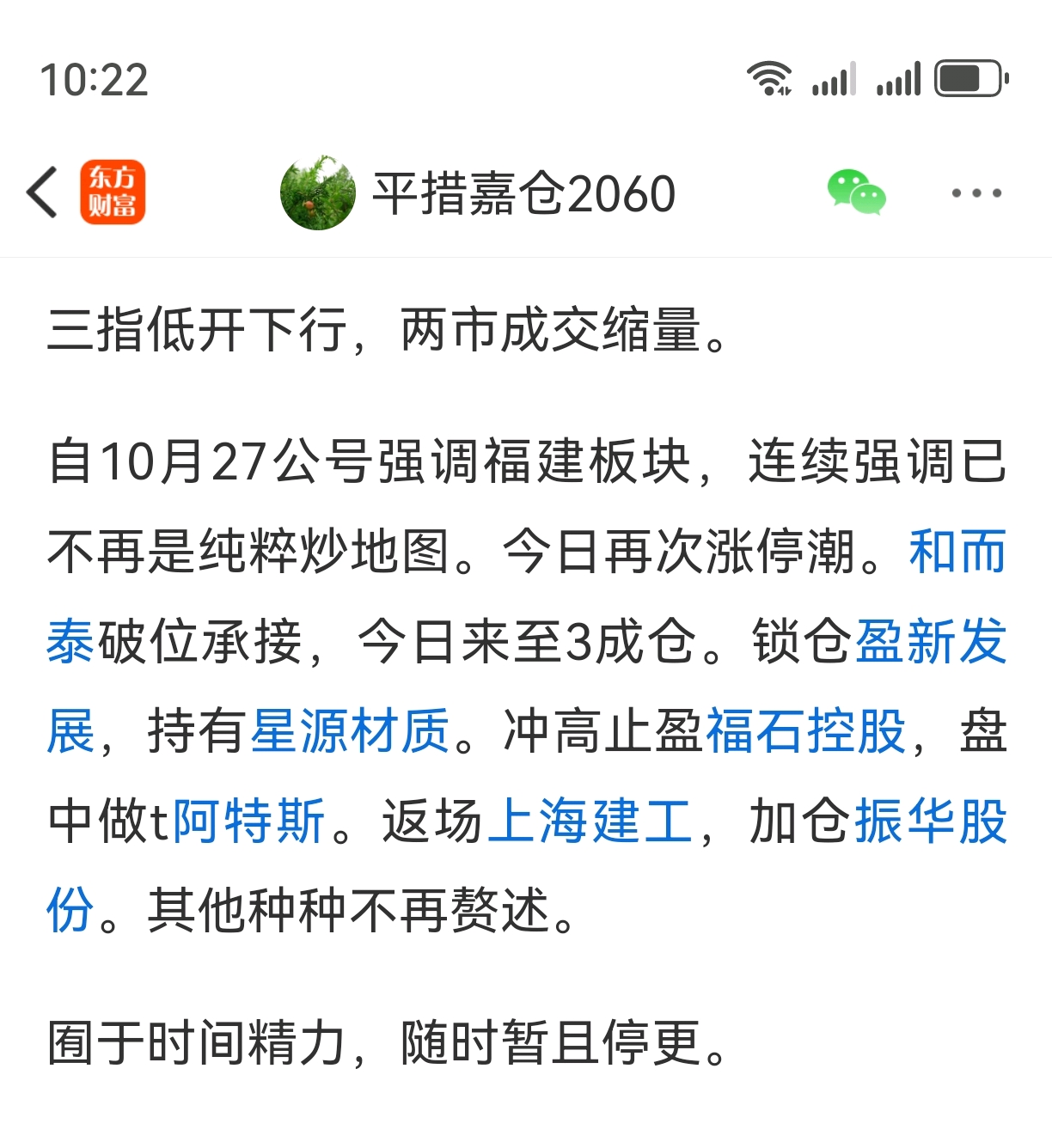 开盘竞价只有300支飘红,不必惊慌。投机极致演绎,吴总绝不允许。开盘加仓和而泰,半仓持有。冲高止盈阿特斯,择机返场。止盈振华股份,加仓盈新发展。持有上海建工,锁定星源材质。开仓统一股份,其他不赘述。人贪我惧,人惧我贪。