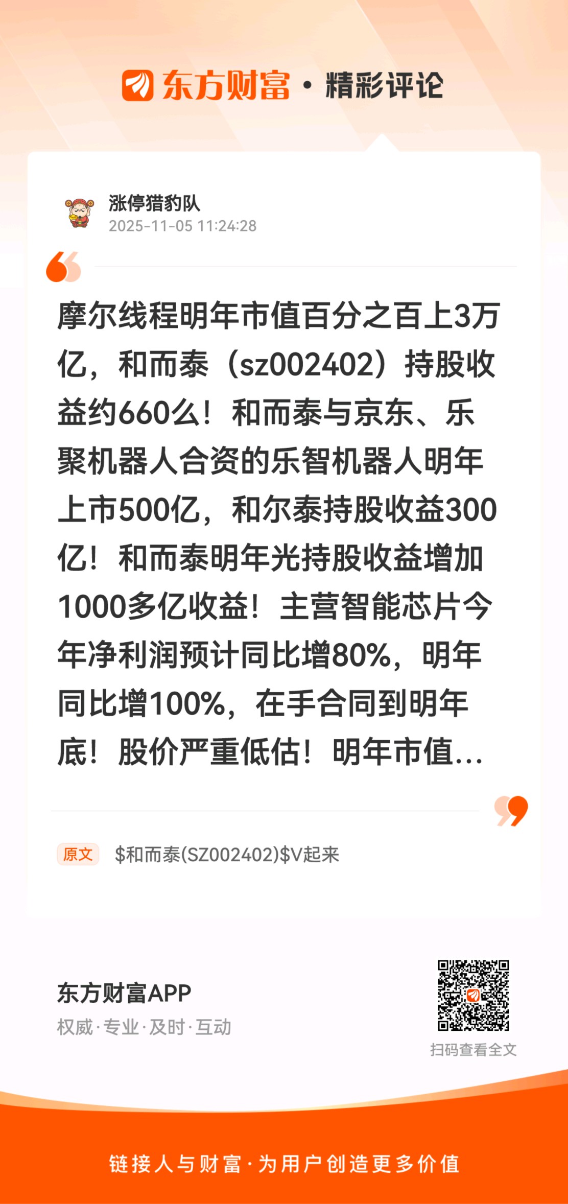 //@涨停猎豹队 :摩尔线程明年市值百分之百上3万亿,和而泰(sz002402)持股收益约660么!和而泰与京东、乐聚机器人合资的乐智机器人明年上市500亿,和尔泰持股收益300亿!和而泰明年光持股收益增加1000多亿收益!主营智能芯片今年净利润预计同比增80%,明年同比增100%,在手合同到明年底!股价严重低估!明年市值至少2000亿以上!