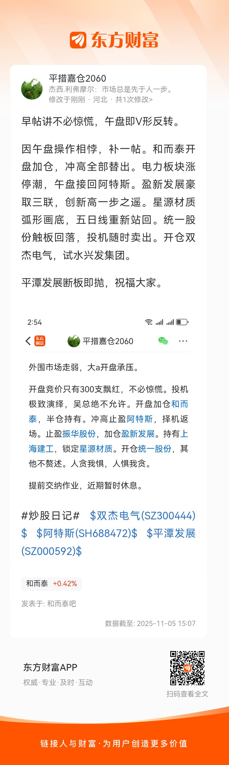 因午盘操作相悖,补一帖。和而泰开盘加仓,冲高全部替出。电力板块涨停潮,午盘接回阿特斯。盈新发展豪取三联,创新高一步之遥。星源材质弧形画底,五日线重新站回。统一股份触板回落,投机随时卖出。开仓双杰电气,试水兴发集团。