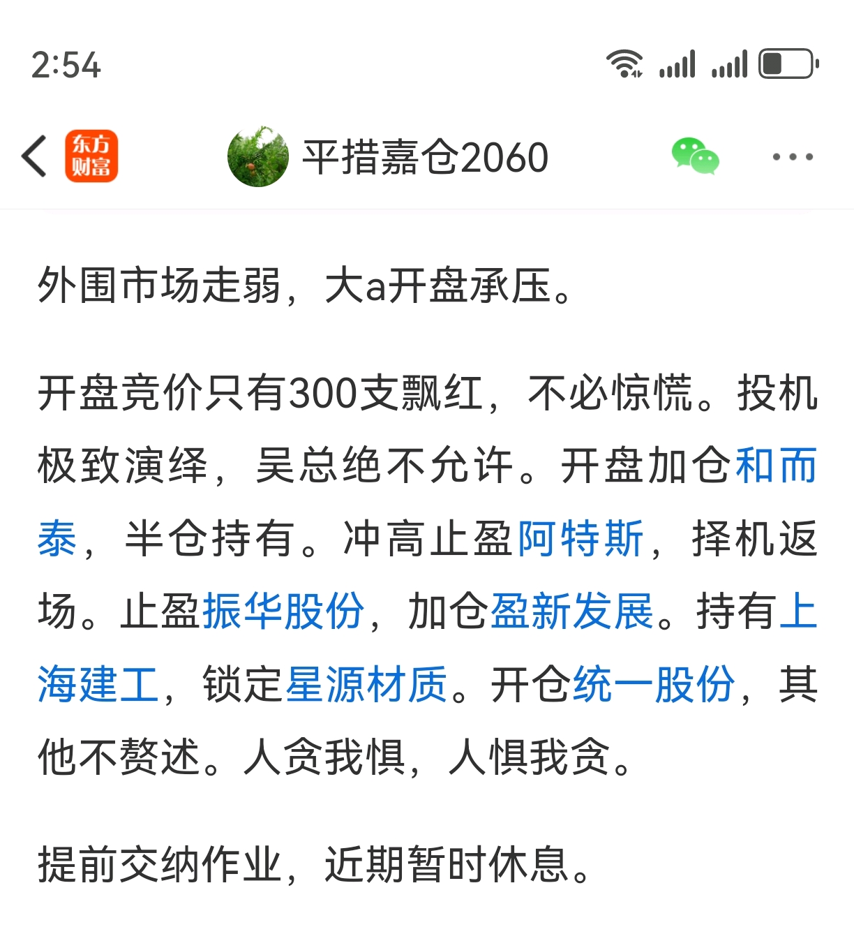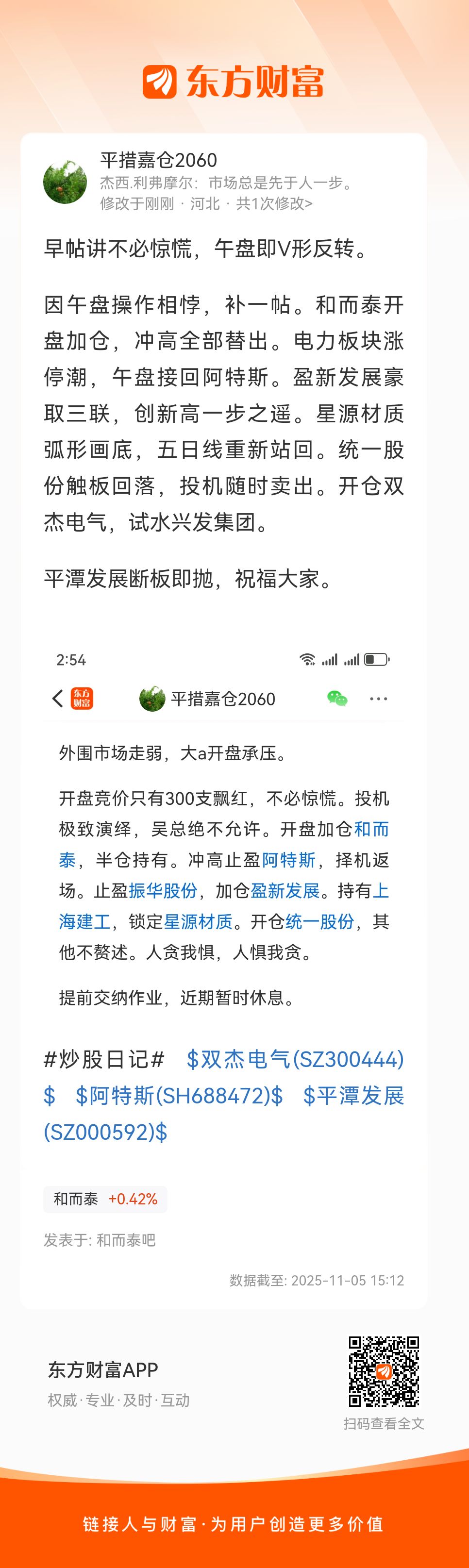 因午盘操作相悖,补一帖。和而泰开盘加仓,冲高全部替出。电力板块涨停潮,午盘接回阿特斯。盈新发展豪取三联,创新高一步之遥。星源材质弧形画底,五日线重新站回。统一股份触板回落,投机随时卖出。开仓双杰电气,试水兴发集团。