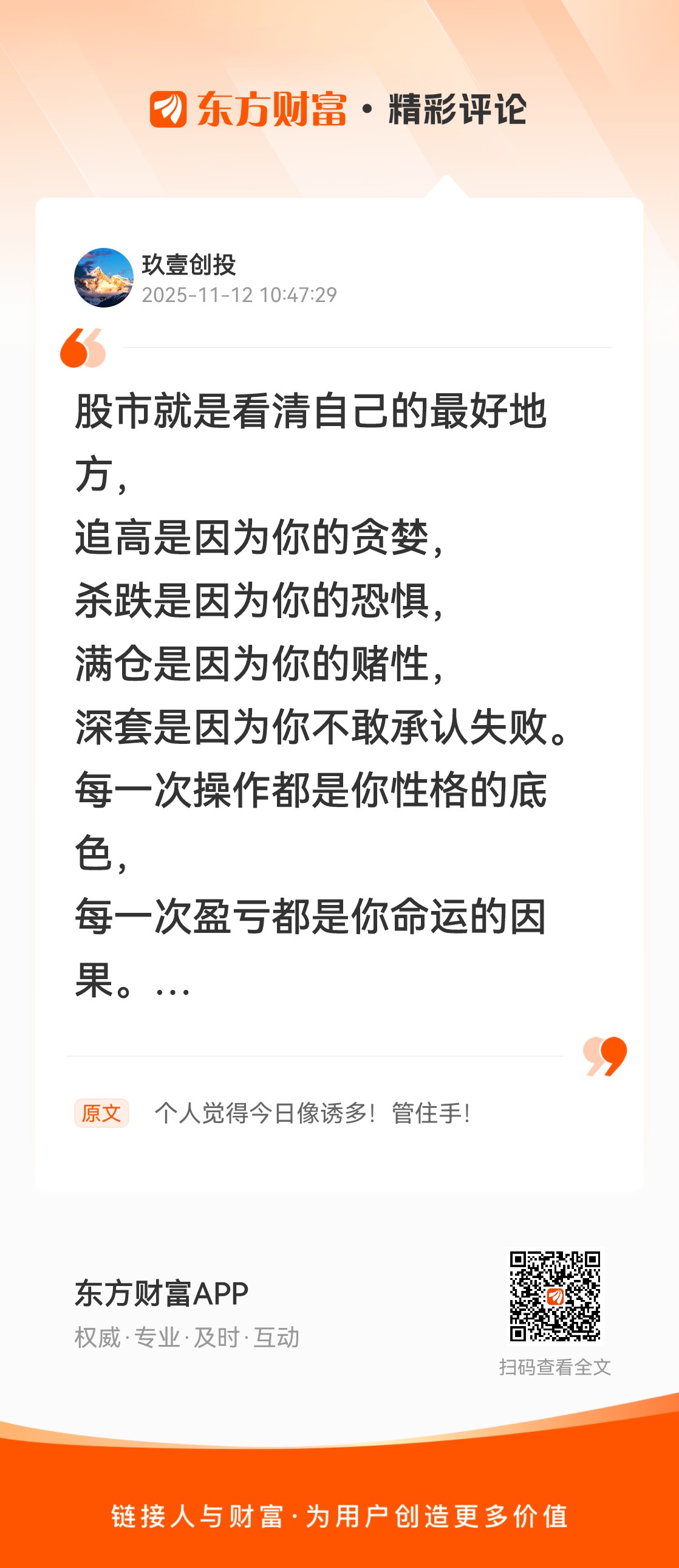 股市就是看清自己的最好地方,追高是因为你的贪婪,杀跌是因为你的恐惧,满仓是因为你的赌性,深套是因为你不敢承认失败。每一次操作都是你性格的底色,每一次盈亏都是你命运的因果。当你不在频繁进出,而是耐心等待确定性出现,你就摆脱了浮躁,当你愿意错过一百次机会,只为等那一刻属于你的节奏,你就真正了解了交易。只要心怀感恩,不贪,不急,有耐心,肯认错,你就知道炒股不是天赋,而是一场修行。 我在《个人觉得今日像诱多!管住手!》的评论获得了大家的关注。