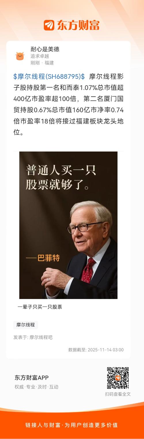 $摩尔线程(SH688795)$ 摩尔线程影子股持股第一名和而泰1.07%总市值超400亿市盈率超100倍,第二名厦门国贸持股0.67%总市值160亿市净率0.74倍市盈率18倍将接过福建板块龙头地位。