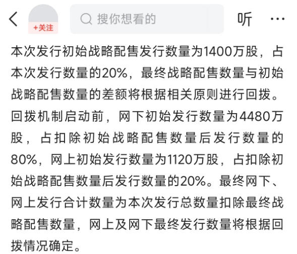 网上发行:初始数量:1120万股(占扣除战略配售后的20%)最终数量根据回拨机制调整