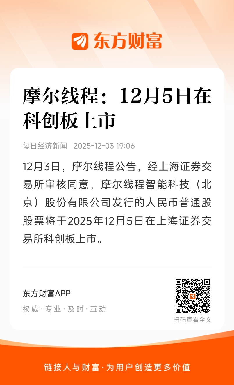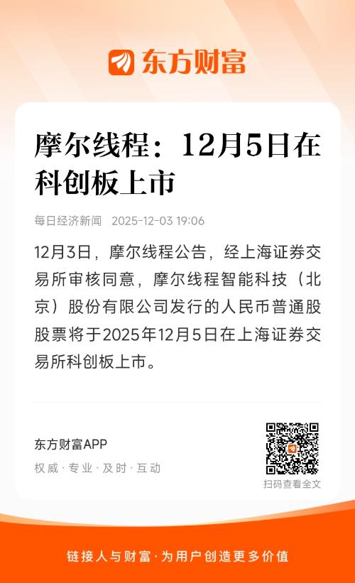 12月3日,摩尔线程公告,经上海证券交易所审核同意,摩尔线程智能科技(北京)股份有限公司发行的人民币普通股股票将于2025年12月5日在上海证券交易所科创板上市。