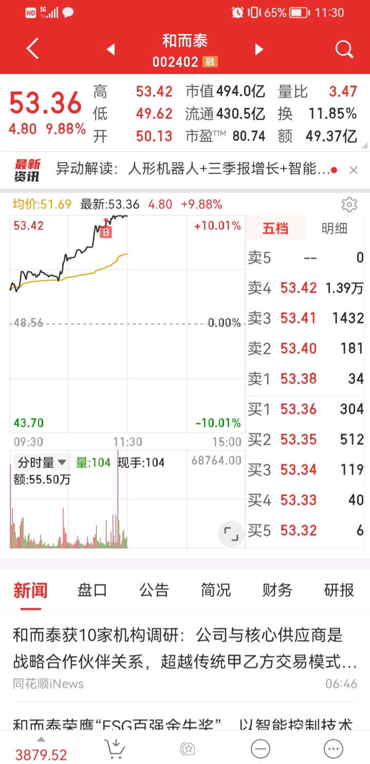 我就知道和而泰是热门股,一涨停人气就会很高,今天看见你快涨停了追进来避险了,早上