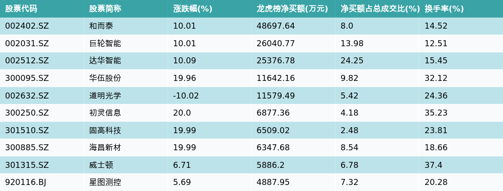 南财智讯12月4日电,南财金融终端数据显示,因当日异动登上龙虎榜的个股中,资金净买入最多的前三位分别是和而泰(002402.SZ)、巨轮智能(002031.SZ)与达华智能(002512.SZ)。其中排名第一的和而泰净买额达4.87亿元,占总成交金额的8.0%。和而泰当日收盘上涨10.01%,换手率为14.52%,净买入额前10个股详情见下图: